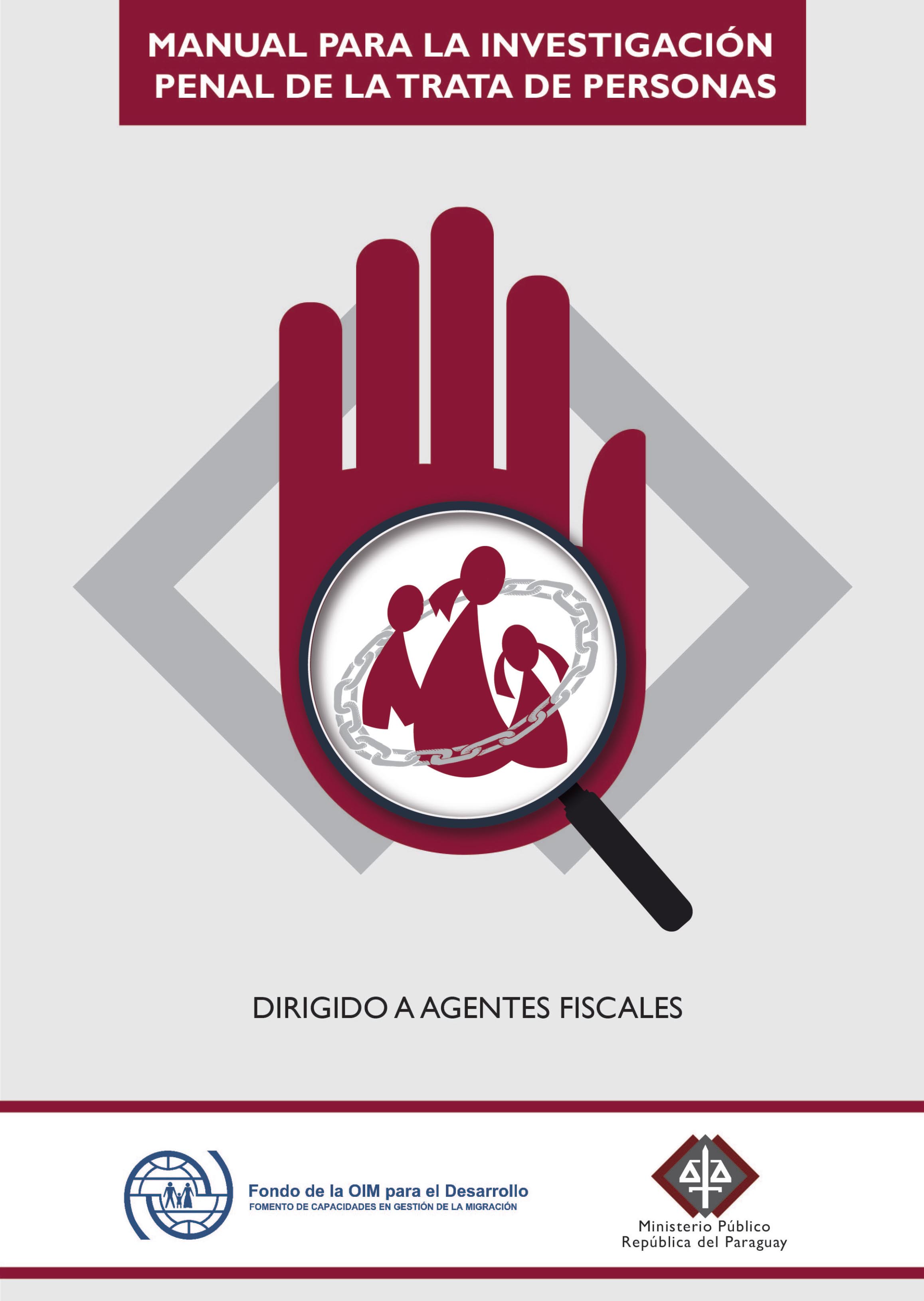 Manual dirigido a agentes fiscales elaborado en el marco del Proyecto Cooperación Técnica para el Fortalecimiento de las Capacidades Gubernamentales en materia y combate a la Trata de Personas , financiado por el Fondo de la OIM para el Desarrollo y ejecutado por el Ministerio Público y la OIM Paraguay.